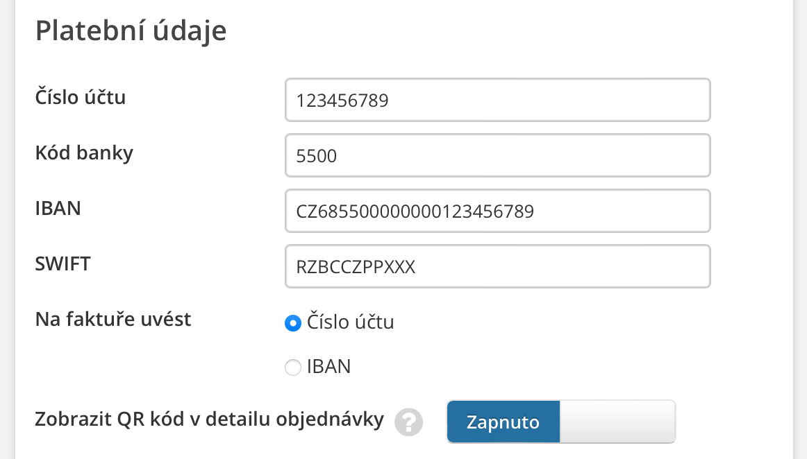 V nastavení e-shopu stačí vyplnit bankovní údaje a objednávky s platbou převodem zobrazí praktické QR kódy.
