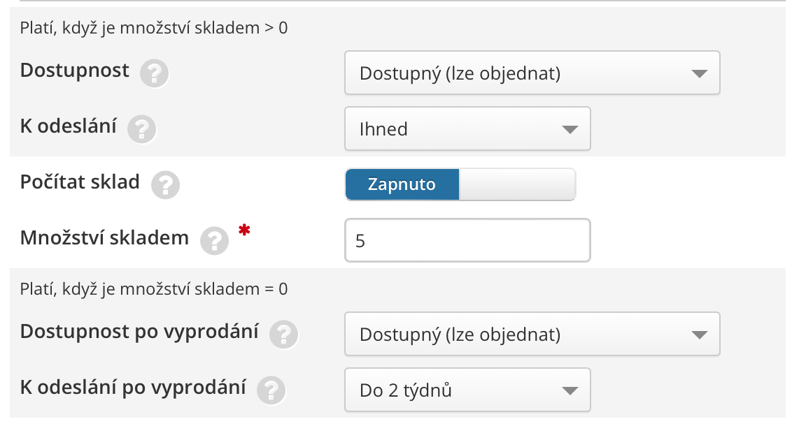 Nově lze nastavit informace o dostupnosti zboží po vyprodání všech skladových položek. Po vyprodání můžete označit zboží za dále již neprodejné, nebo stále k dodání, ale po určité době.